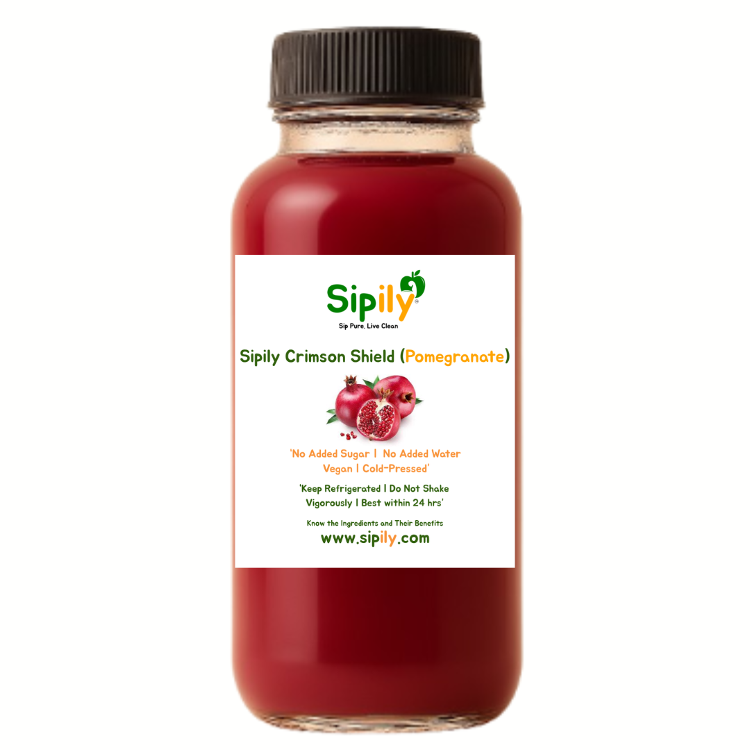 Deep ruby pomegranates juiced slow and cold—rich in antioxidants, bold in flavor.